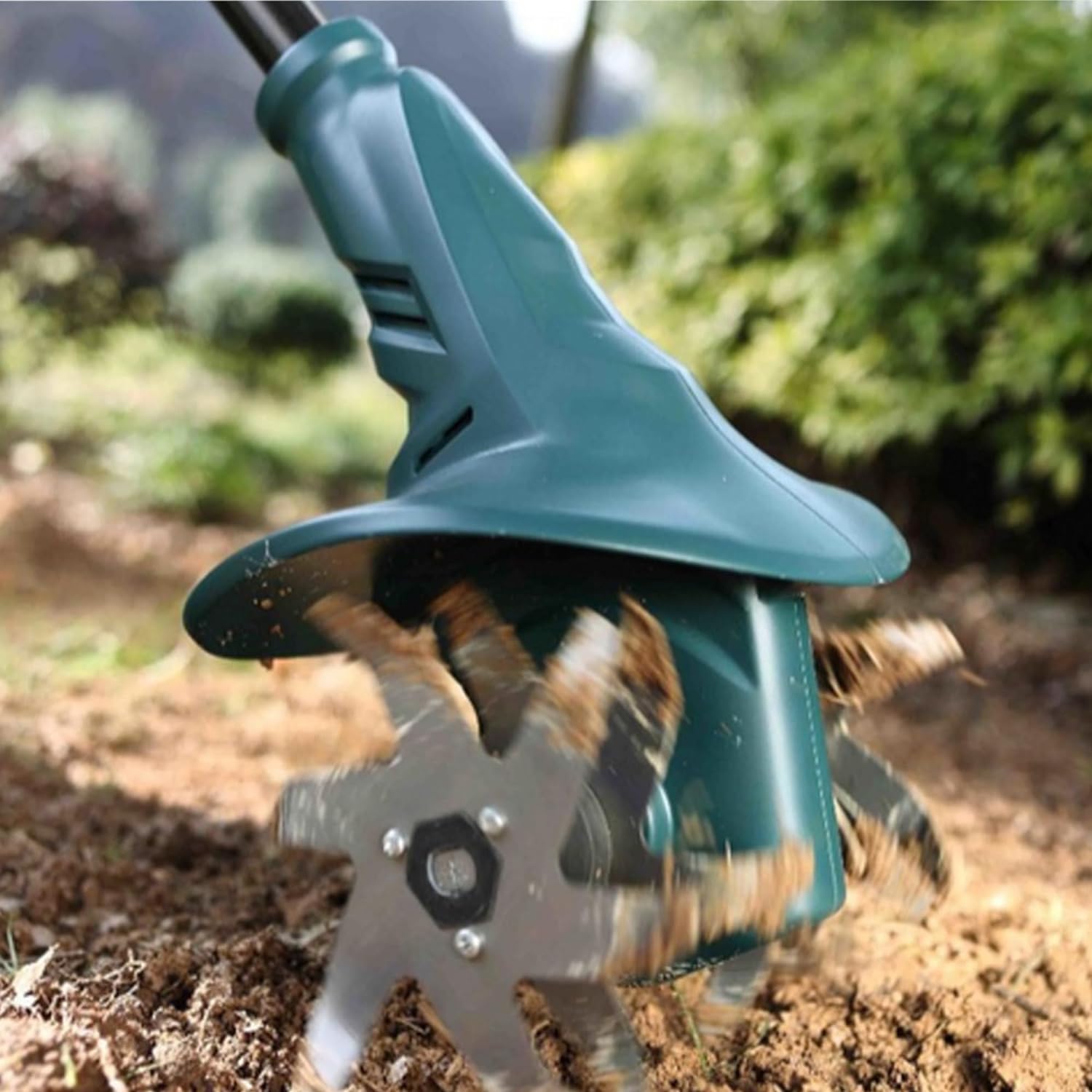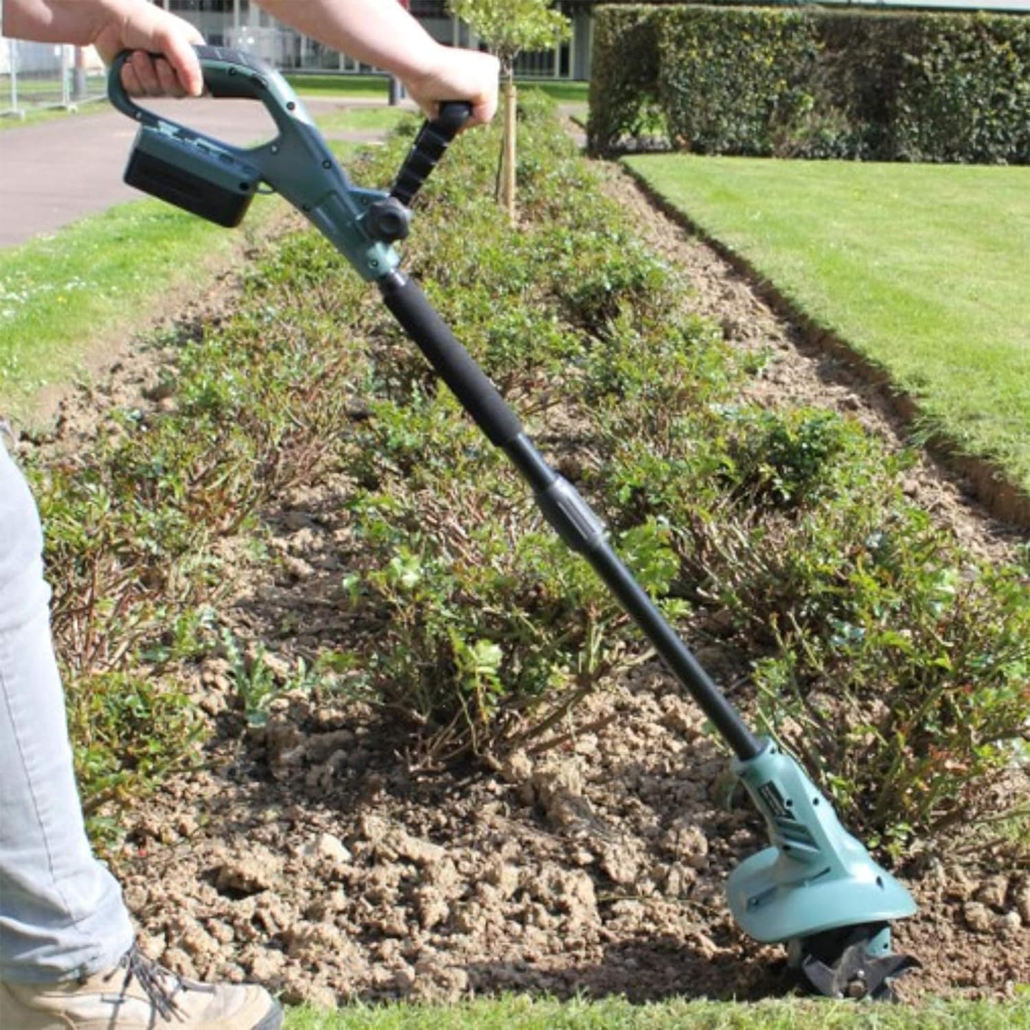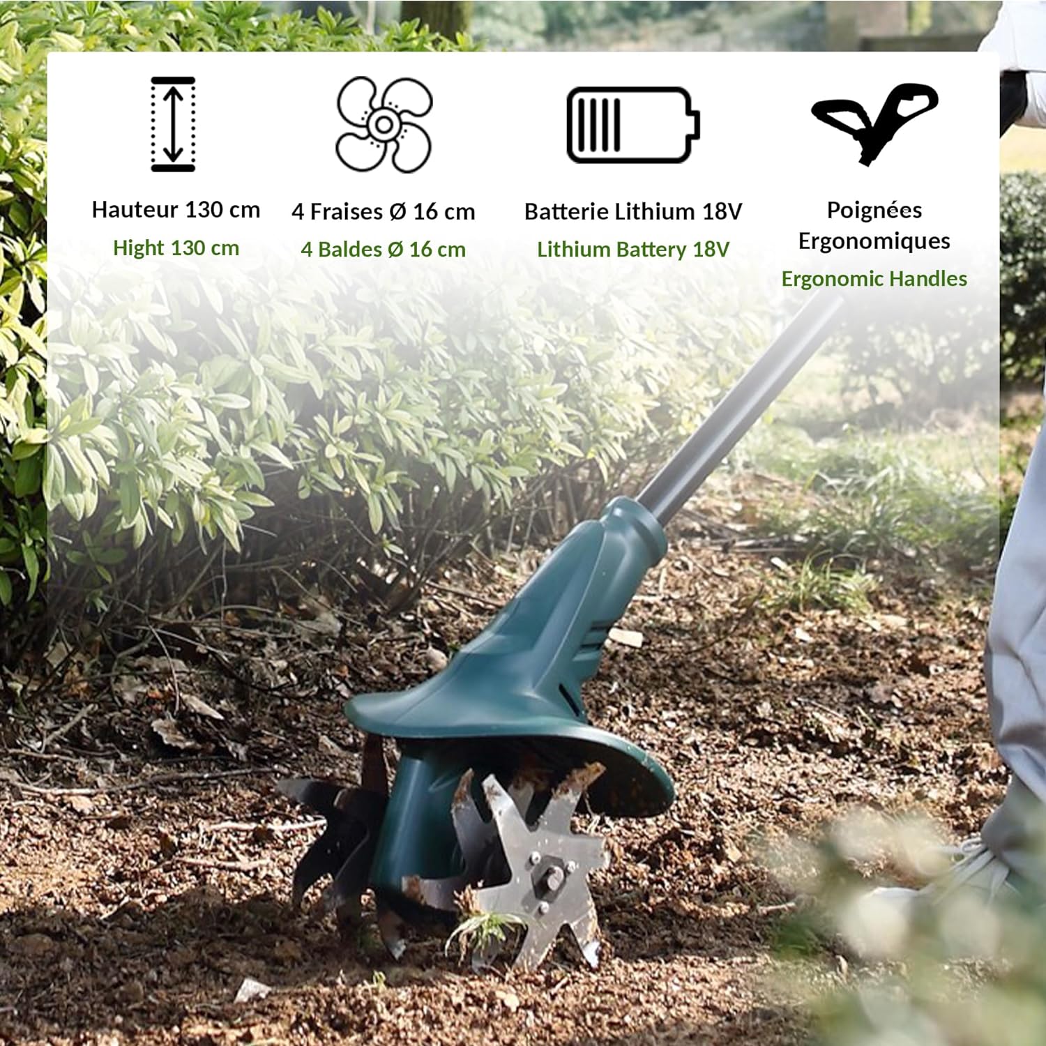FISHTEC Wireless motor hoe with lithium battery 18 V, working width: 20 cm, working depth: 8 cm, 4 routers, ergonomic double handle, battery and charging station incl.