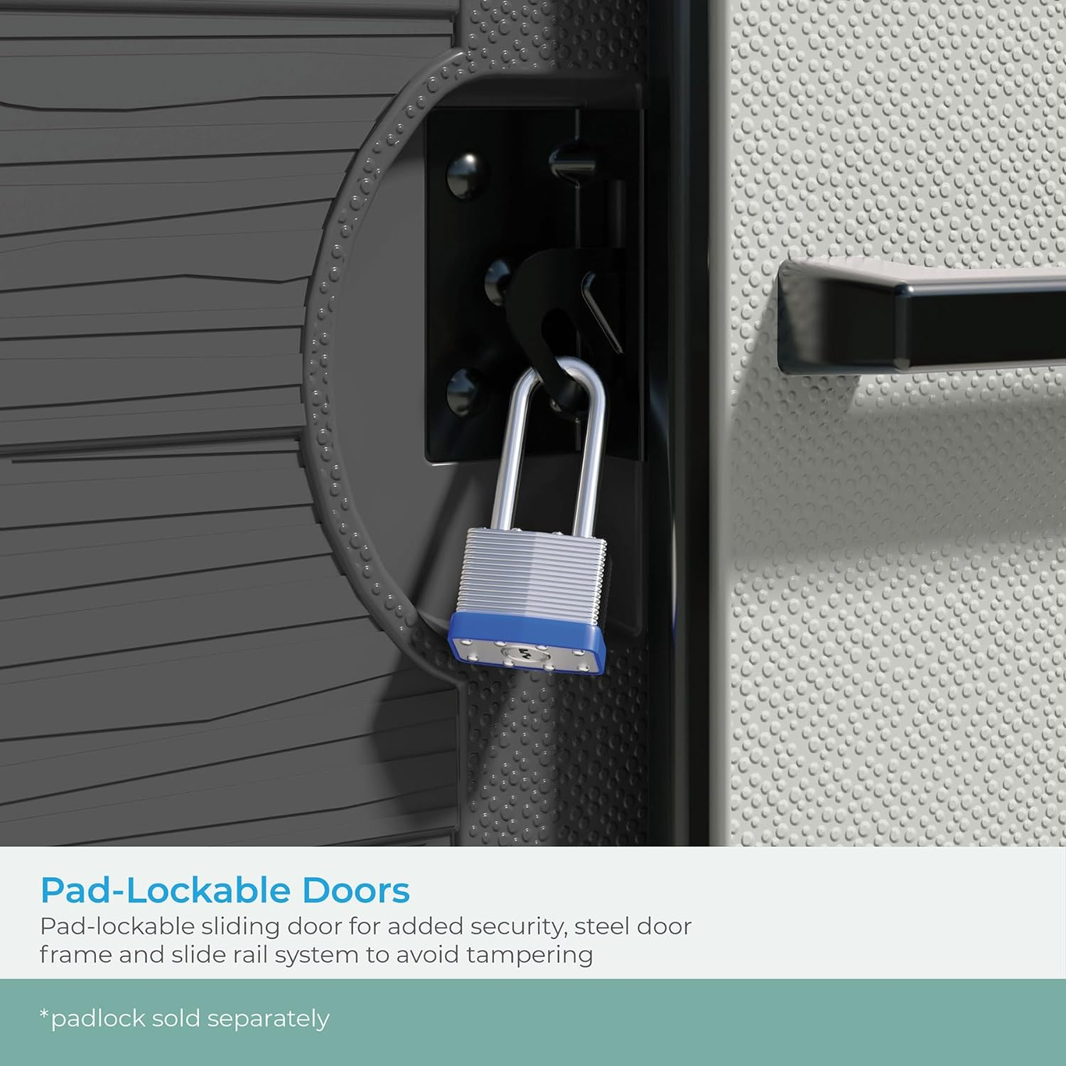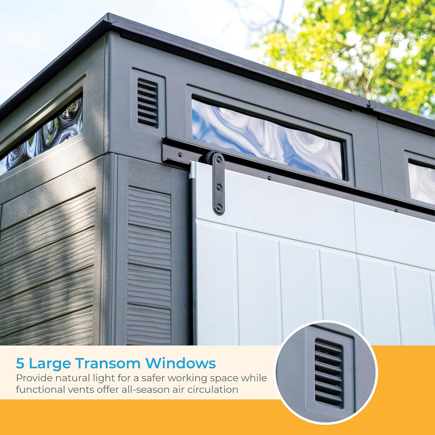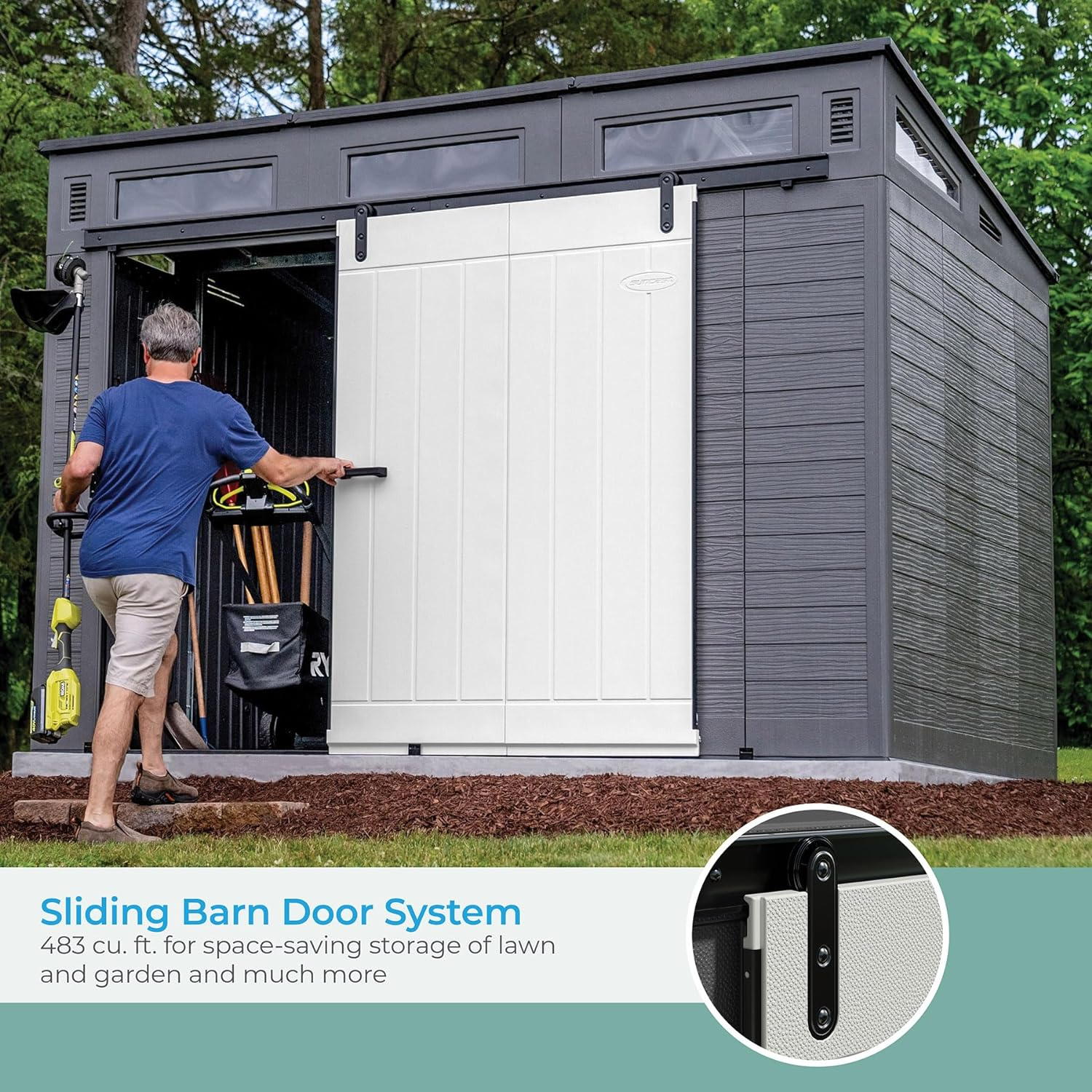 Suncast Modernist 10 Foot by 7 Foot Outdoor Plastic Storage Shed with Pad Lockable Sliding Barn Door for Outdoor Storage Items, Gray and Black