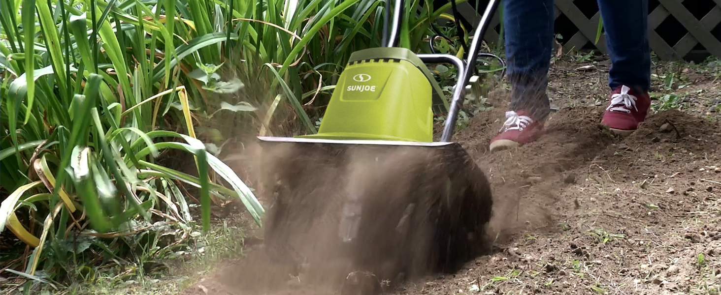 THE DIRTY LITTLE SECRET OF GREAT GARDENS. Experience the one tiller that’s truly up to the task! Introducing a greener, cleaner way to get dirty with the Sun Joe TJ604E Electric Tiller Cultivator. A powerful 13. 5-amp motor quickly pulverizes dirt, effortlessly slicing through the soil at 370 RPM, ensuring maximum aeration and perfectly preparing the seedbed for planting. Cultivate an area 16-inches wide and up to 8-inches deep in seconds. Control weeds where needed - Sun Joe tames the toughest yard and garden tasks with more comfort and less strain. 3-position, height-adjustable rear wheels make it easy to maneuver wherever it’s needed - and its collapsible handle makes it a cinch to store when it’s not.