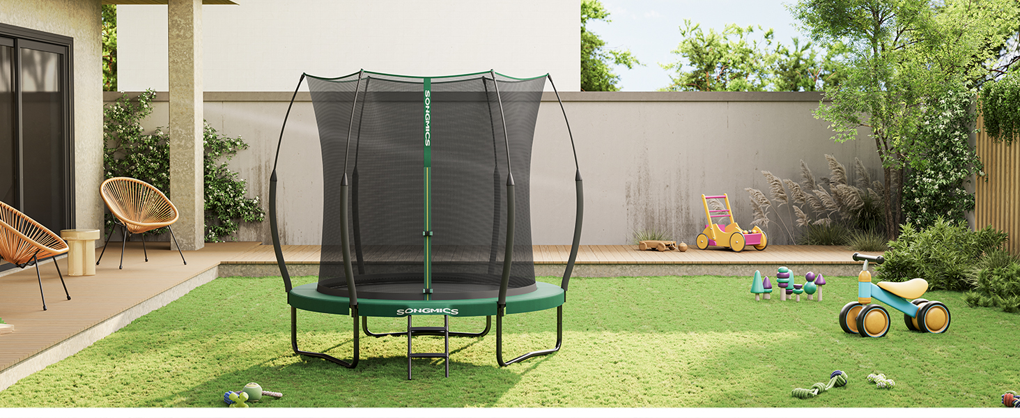 - Sicher: Elastische Seile anstatt Federn – das Trampolin verhindert Kratzer und Abschürfungen am Körper. Außerdem sorgt der Reißverschluss für eine sichere Verbindung zwischen dem Schutznetz und der Sprungmatte, damit die Füße Ihrer Kinder nicht stecken bleiben.