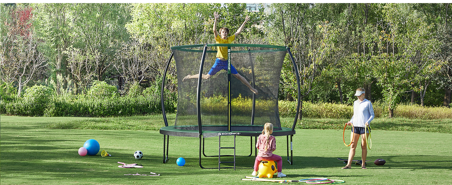 Das PP-Sprungtuch des Gartentrampolins ist reißfest, UV-resistent und langlebig, sodass Sie über viele Sommer hinweg Freude daran haben.