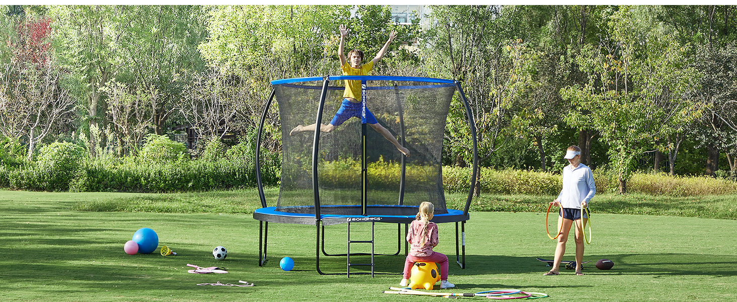 SONGMICS Trampolin Outdoor Ø 366 cm, rundes Gartentrampolin für Kinder mit Sicherheitsnetz, Randabdeckung, Leiter und gepolsterten Stangen