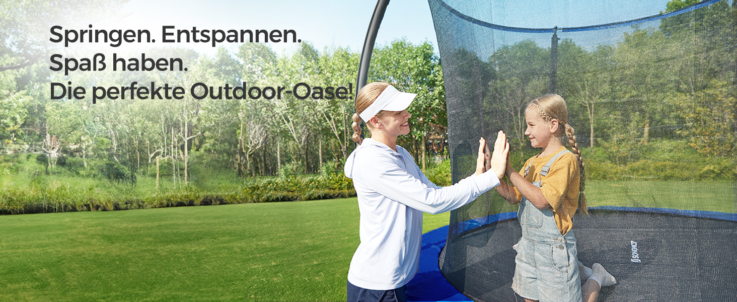Das PP-Sprungtuch des Gartentrampolins ist reißfest, UV-resistent und langlebig, sodass Sie über viele Sommer hinweg Freude daran haben.
