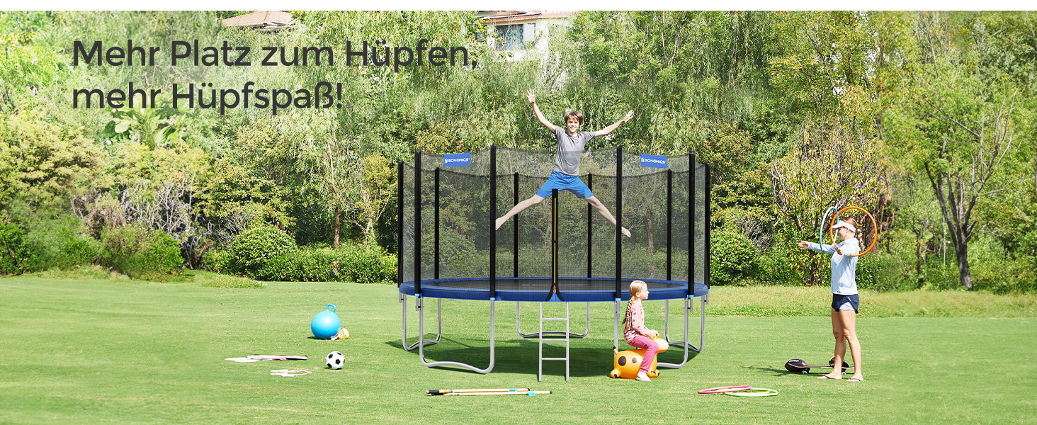 - Sprungtuch: Das hochwertige PP-Sprungtuch ist witterungsbeständig und bietet Komfort beim Springen.