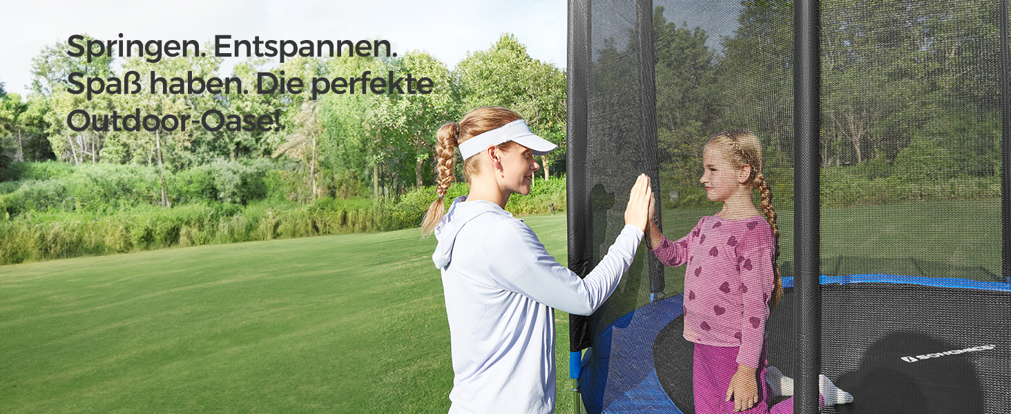 Das PP-Sprungtuch des Gartentrampolins ist reißfest, UV-resistent und langlebig, sodass Sie über viele Sommer hinweg Freude daran haben.